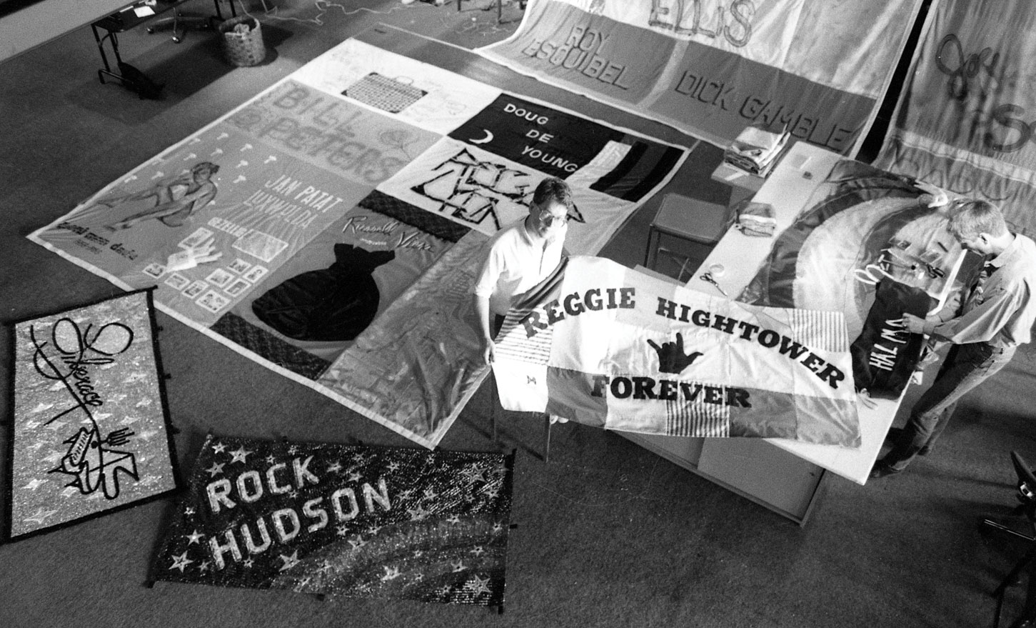 San Francisco-based LGBT activist Cleve Jones (center) helped found the NAMES Project AIDS Memorial Quilt in 1987. He created the first panel to honor his friend Marvin Feldman. Photo by Liz Hafalia/The San Francisco Chronicle via Getty Images.