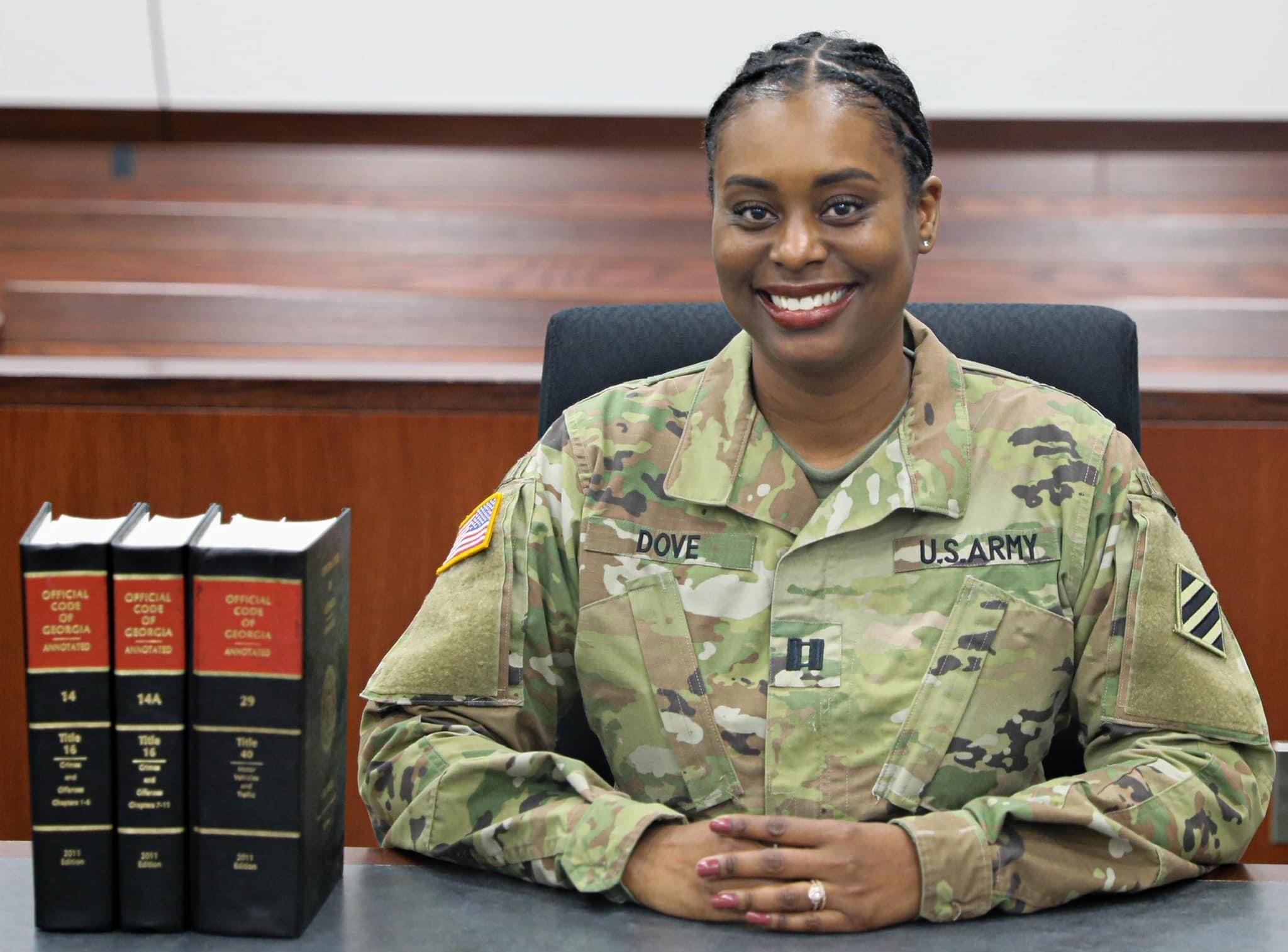 Dove, a 2015 law school graduate, now serves on active duty. In 2021, she joined the Army JAG Corps, where in her role as a government appellate attorney, she argued and won three cases at the Court of Appeals for the Armed Forces. In August, she started a new job as a trial defense service attorney.